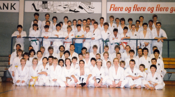 Wado-NM i Gøteborg 27. oktober 1984: Fra venstre ses de fleste danske deltagere, forrest f.v. Kim Hansen og Palle T. Jensen. Fra Danmark stillede i alt 9 deltagere.