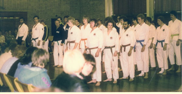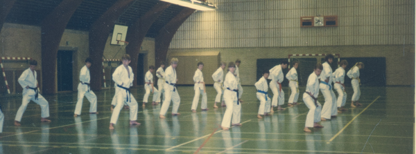 Norge – Danmark for 2. gang i DK d. 28. april 1979 i Katrinebjergskolen i Århus. Forrest i billedet ses t.h. Århus Kumikata, fra venstre: John Jensen, Kim Hansen, Rudi Paacks Jensen, Alex Jensen, Jan Michael Jensen og Leif Hansen. Ved siden af står Horsens Wadokai Karate-do, Palle Petersen forrest. Fra Norge ses f.v. Peter Weetman, Arne Nestor, Arild Lund, Helge Dehlin og Øistein Riber.