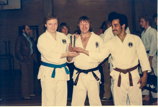 Århus Kumikata vinder hold-kata d. 10. maj 1980 ved landsstævne Norge – Danmark, som holdtes i Hasle Skole og var det 3. og sidste af slagsen i Danmark. Fra venstre: Jan Michael Jensen, John Jensen og Rudi Paacks Jensen.